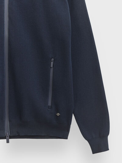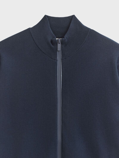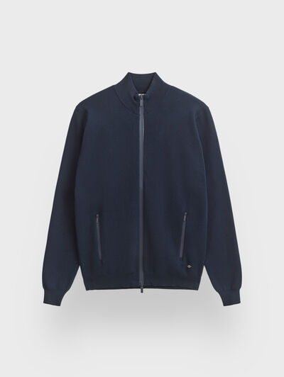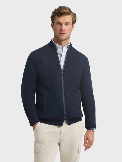 Cárdigan confeccionado en algodón con cierre central mediante doble cremallera, manga larga con acabado de puños ribeteados, dos bolsillos con cierre de cremallera en la cintura y detalle personalizado al tono en el bajo. Cremalleras termoselladas. Corte regular fit.